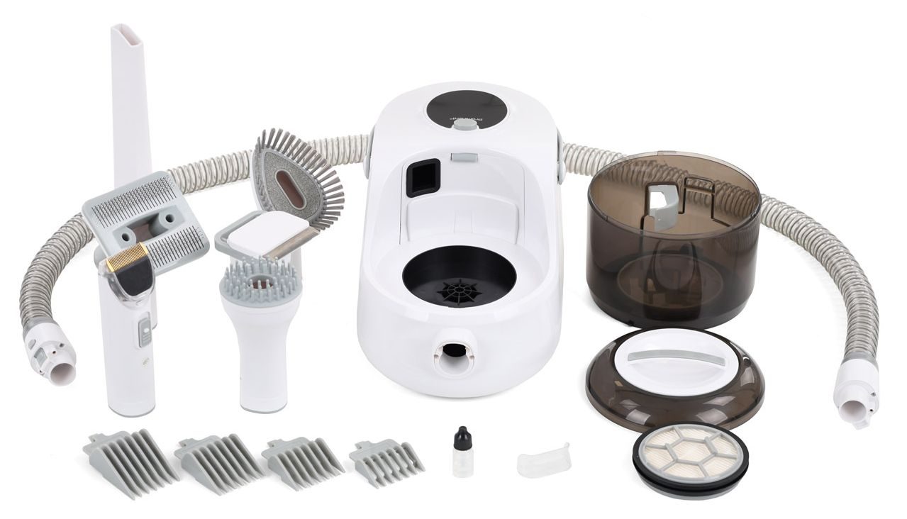 Stříhací strojek – Pokud je potřeba, můžete použít stříhací strojek pro precizní střihání a holení srsti. Tento nástroj je vybaven funkcí odsávání chlupů přímo do sběrné nádoby, což usnadňuje úklid po stříhání a vyčesávání.