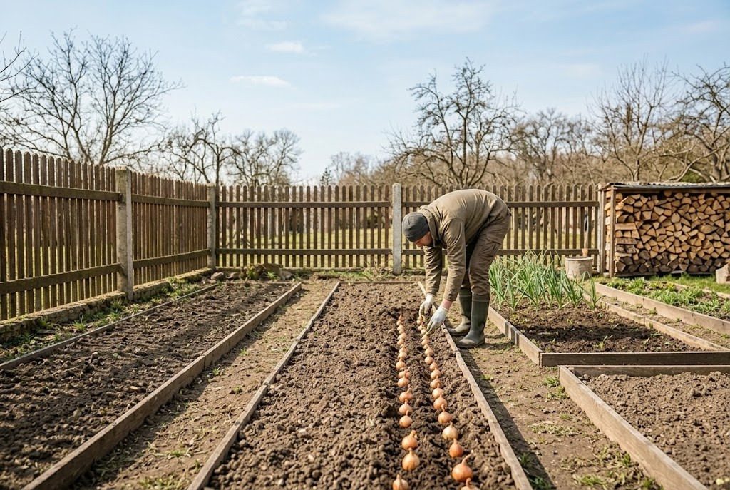 | Cibule sazečka, Česnek (jarní) | Záhon (venku) | Sázejte do připravených řádků, špičkou nahoru. | |