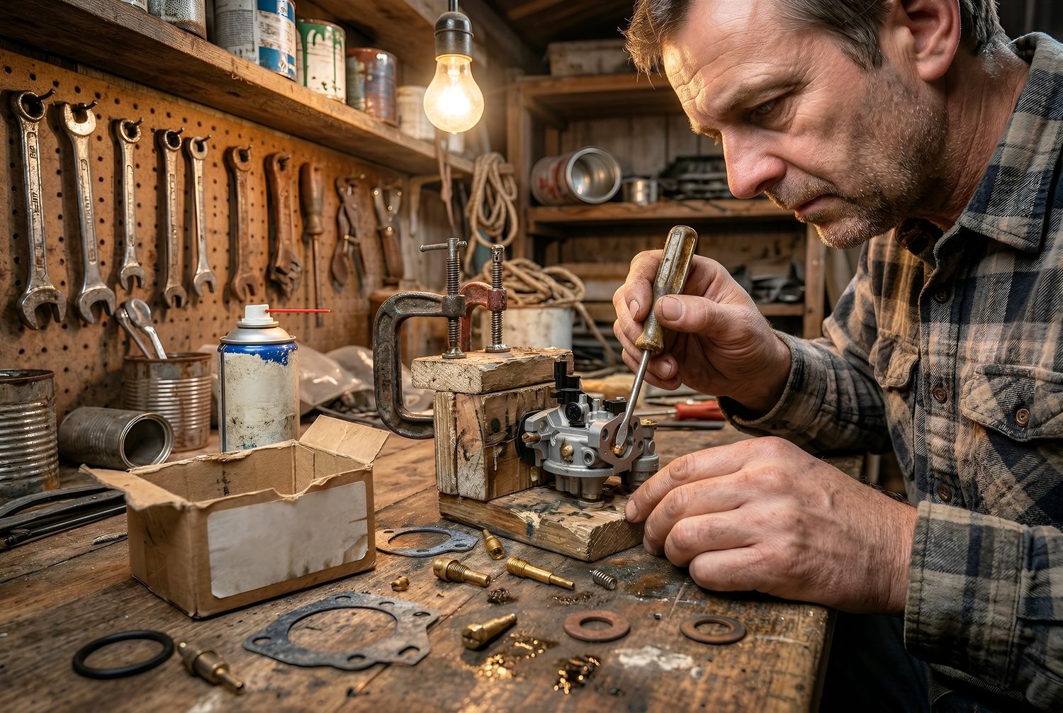 Pustili jsme se do toho. Karburátor ven, rozebrat do šroubku. Následovaly dvě hodiny piplačky – mechanické odškrabování gelovitého nánosu, prostřikování čističem a nekonečné profukování kompresorem.