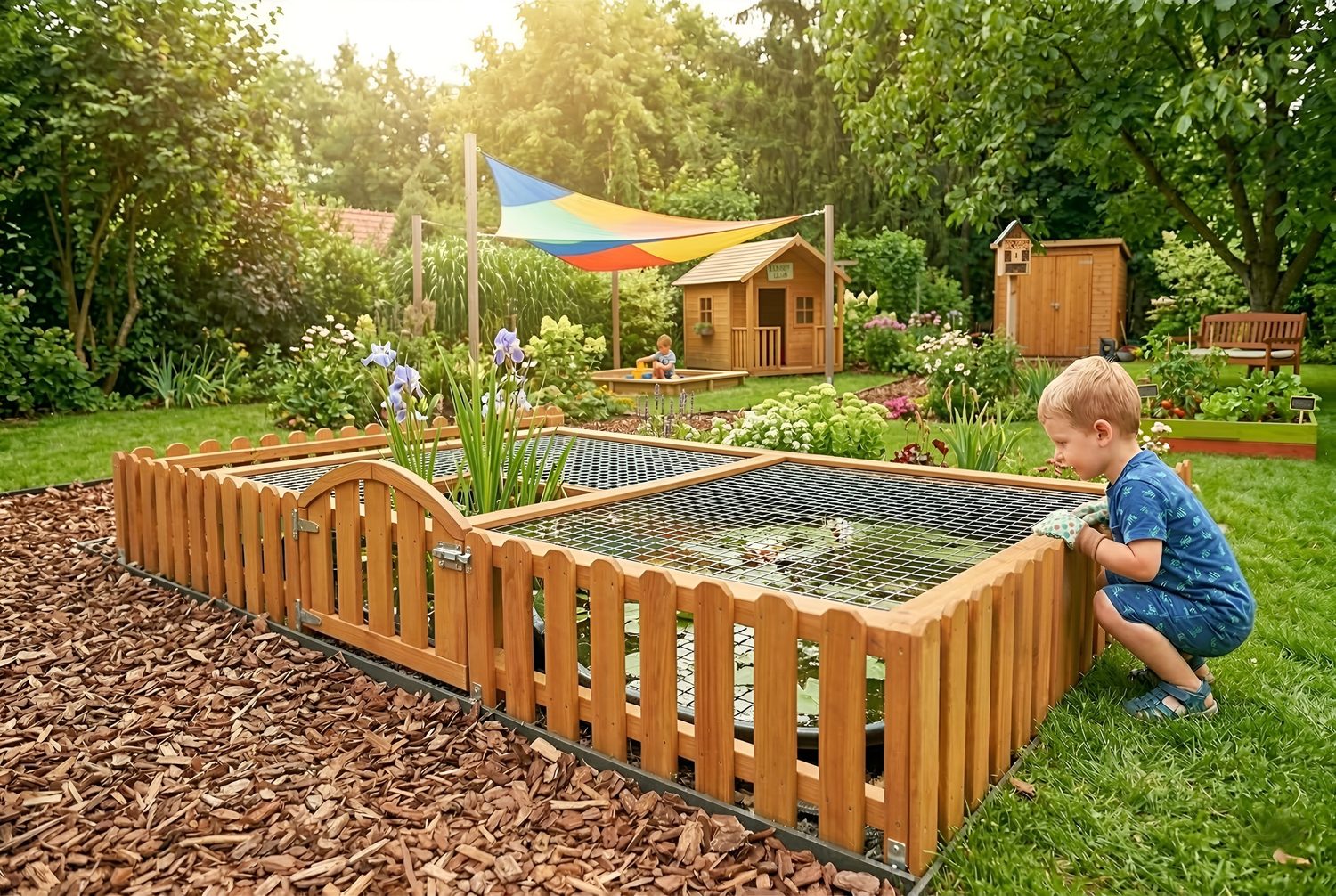 - Voda pod kontrolou: Jezírka a sudy na dešťovou vodu jsou pro děti magnetem. Sudy vždy opatřete pevným víkem a jezírka zajistěte podhladinovou mříží nebo dekorativním, ale funkčním oplocením.
