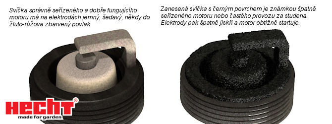 - Zkontrolujte zapalovací svíčku. Svíčka ve správně fungujícím motoru nesmí být nadměrně zanesena černými sazemi a karbonem, především prostor mezi elektrodami musí být úplně čistý.