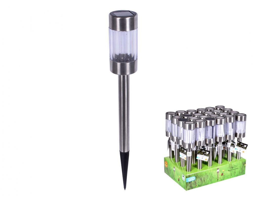 LED solární lampa nerezová, rozměr 5 x 5 x 39 cm, solární panel Amorphous, vel. 34 x 34 mm, vyměnitelná baterie 1ks, 1.2 V AAA Ni-MH 100 mAh. LED 1ks teplá bílá 6500 - 9000K.