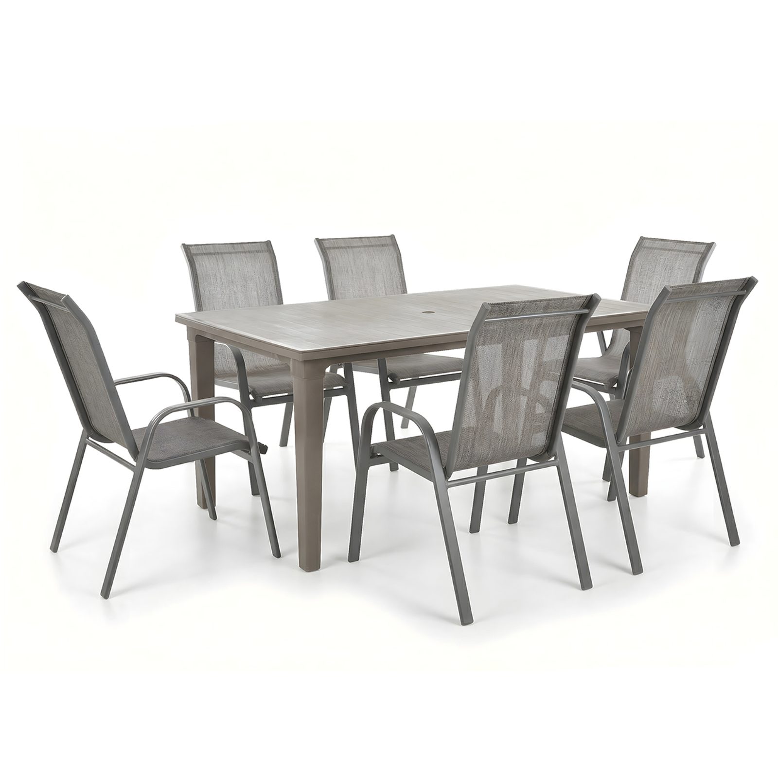 Velmi praktická sestava zahradního nábytku složená ze šesti židlí a jednoho stolu. Odolná vůči nepříznivým povětrnostním podmínkám a UV záření. Sada je vyrobena z velmi odolného plastu. Velmi snadná údržba a čištění. Vhodné i pro použití ve vlhkém prostředí. Stůl: Š 157 x H 98 x V 74 cm / židle: Š 55 × H 75 × V 95 cm