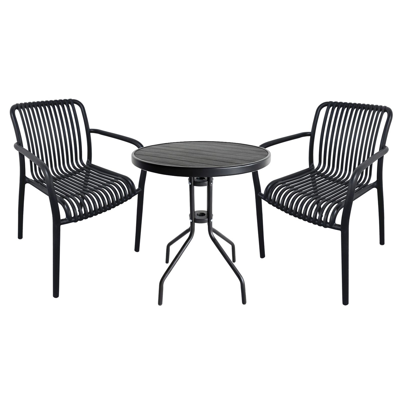 Ideální set stolu a dvou židlí pro balkony a malé plochy. Kovový rám stolu. Deska stolu je plast s dřevěným vzhledem. Židle je celoplastová s maximálním zatížením 160 kg.