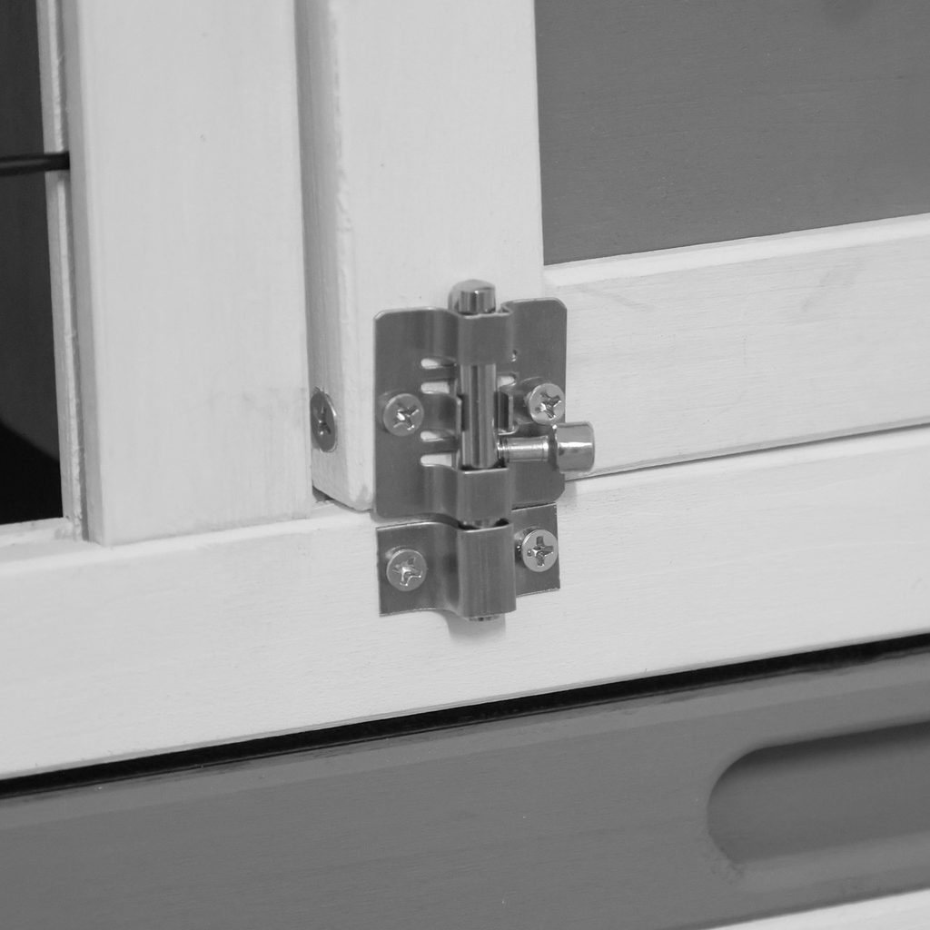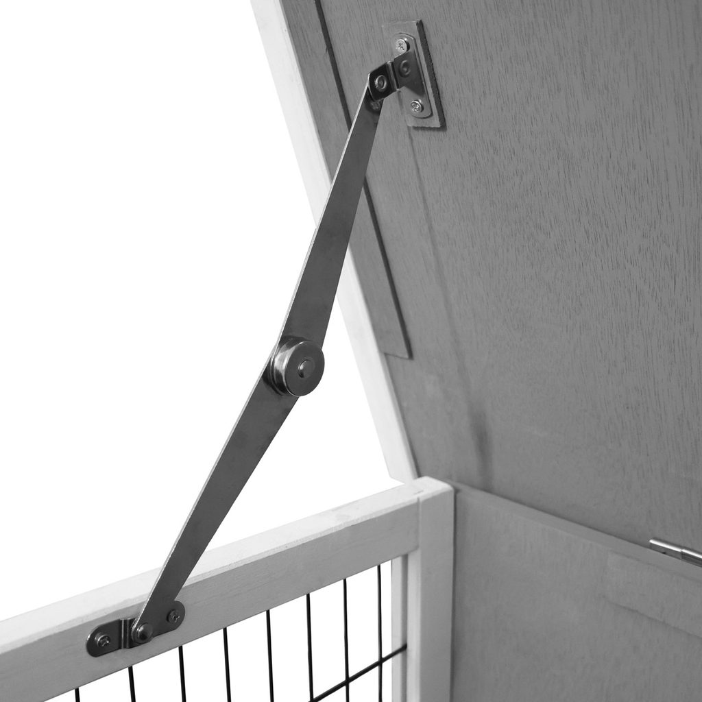 Konstrukce je vyrobena z odolného jedlového dřeva, které zajišťuje dlouhou životnost a stabilitu. Střecha je pokryta asfaltovými šindeli, což chrání vnitřní prostory před deštěm a nepříznivým počasím. Králíkárna má kompaktní rozměry 91,5 × 45 × 116 cm, takže se hodí jak do zahrady, tak do prostornějších chovatelských místností.